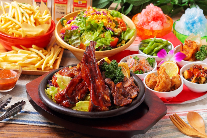 ハワイアンなドリンクと一緒に楽しむのは、3種のお肉のハワイアンBBQセット(税込2,580円)。スモーキーBBQスペアリブやテリヤキBBQチキンなど、ハワイアンビールによく合うお肉が盛りだくさんです。