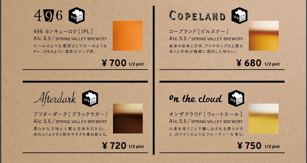 今回のリニューアルで、最新クラフトビールサーバー「Tap Marché(タップ・マルシェ)」が導入されました。最新サーバーで注がれる「SPRING VALLEY BREWERY」の樽生クラフトビールは、キンキンに冷えて料理と相性抜群!次の4種類のクラフトビールを楽しむことができます。