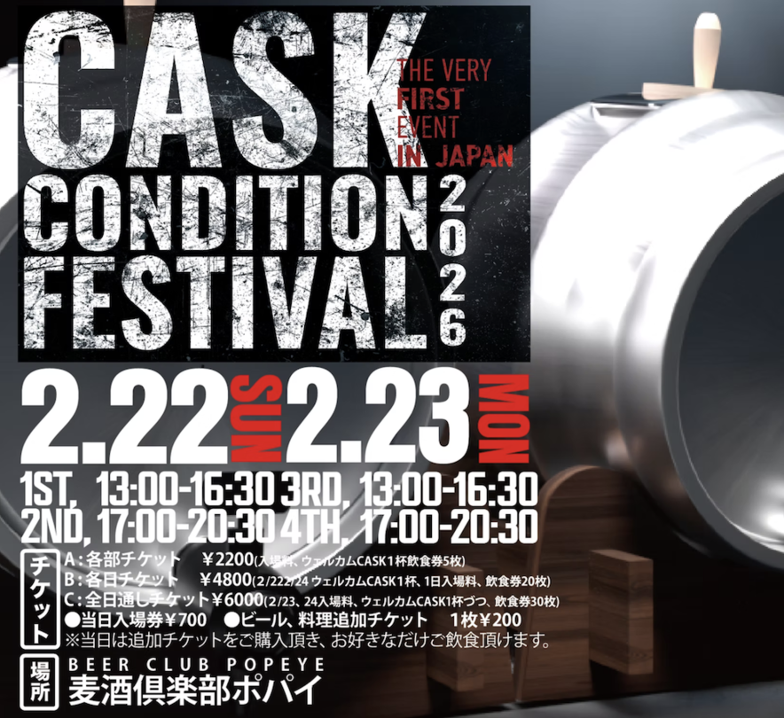 東京都墨田区の「麦酒倶楽部ポパイ」にて、英国の伝統製法である「カスク・コンディション・エール」を集めた専門イベント「CASK Condition Festival 2026 in POPEYE」が、2月22日(日)と23日(月・祝)に開催されます。