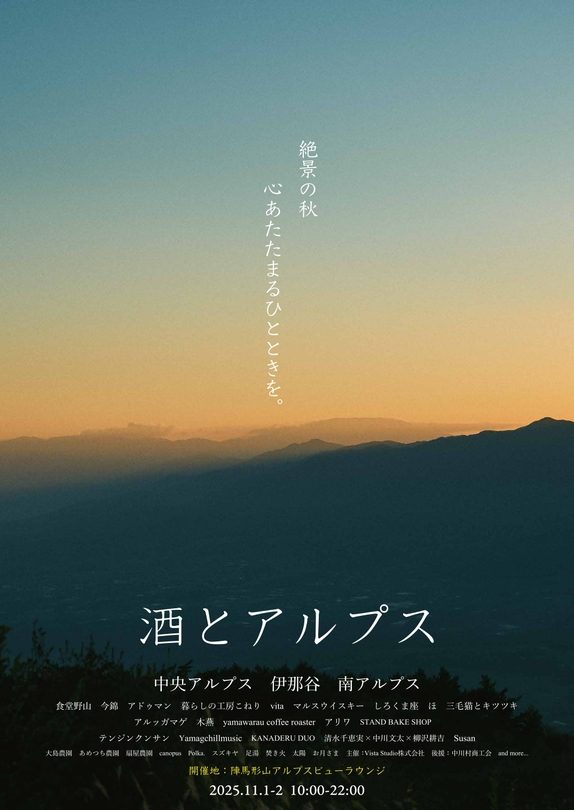 長野県中川村・陣馬形山山頂にて、お酒と音楽のアウトドアイベント「酒とアルプス2025」が、11月1日(土)・2日(日)に開催されます。