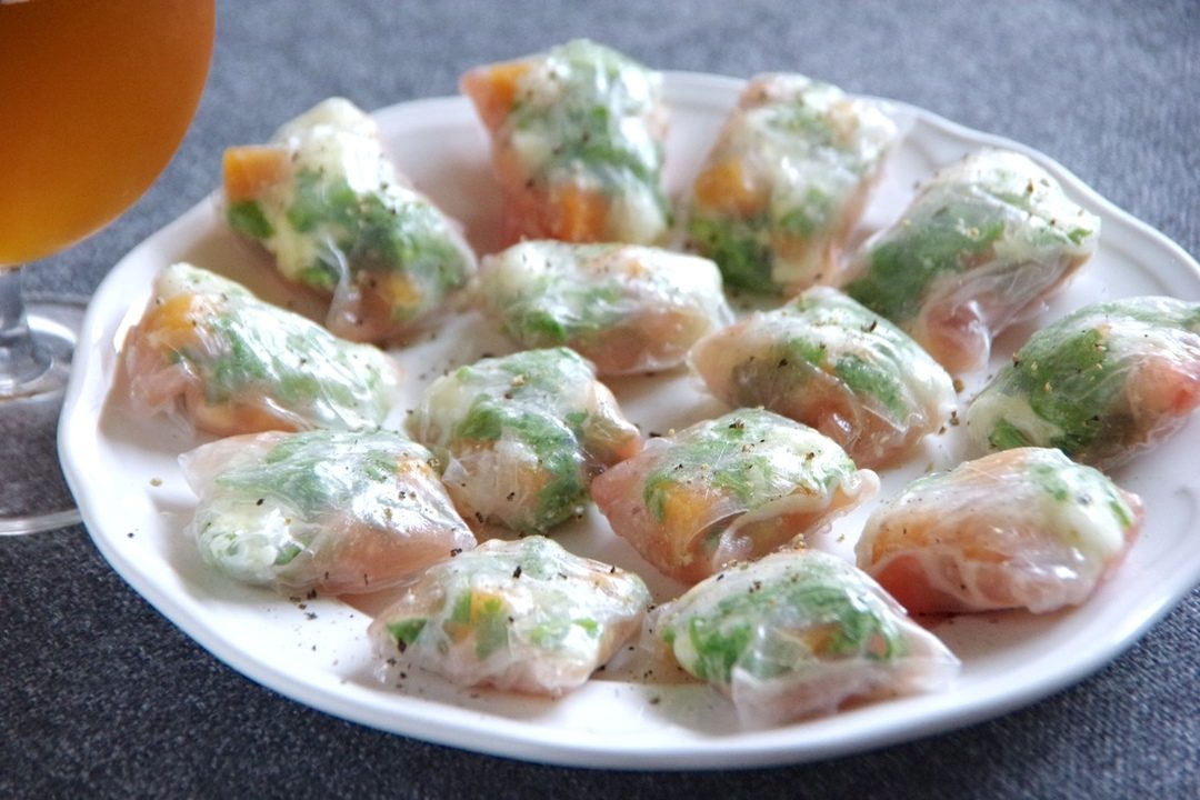 35. 春菊と柿、生ハムとカッテージチーズのひとくち生春巻き