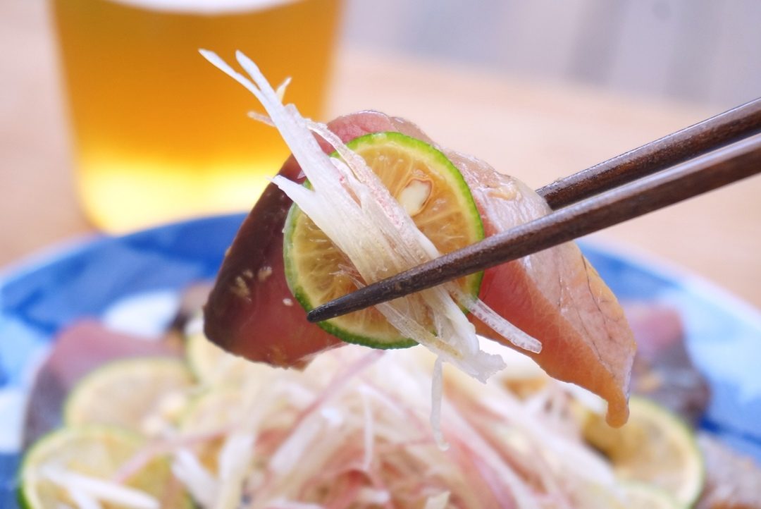 脂がのった『戻り鰹』を、『生姜醤油』と『すだち』の漬けだれでさっぱりむっちり仕上げた秋の一皿。『茗荷』も一緒にいただけば、爽やかな香りと濃厚な鰹の旨みが広がります。軽やかな酸味のあるビールを合わせてみて!