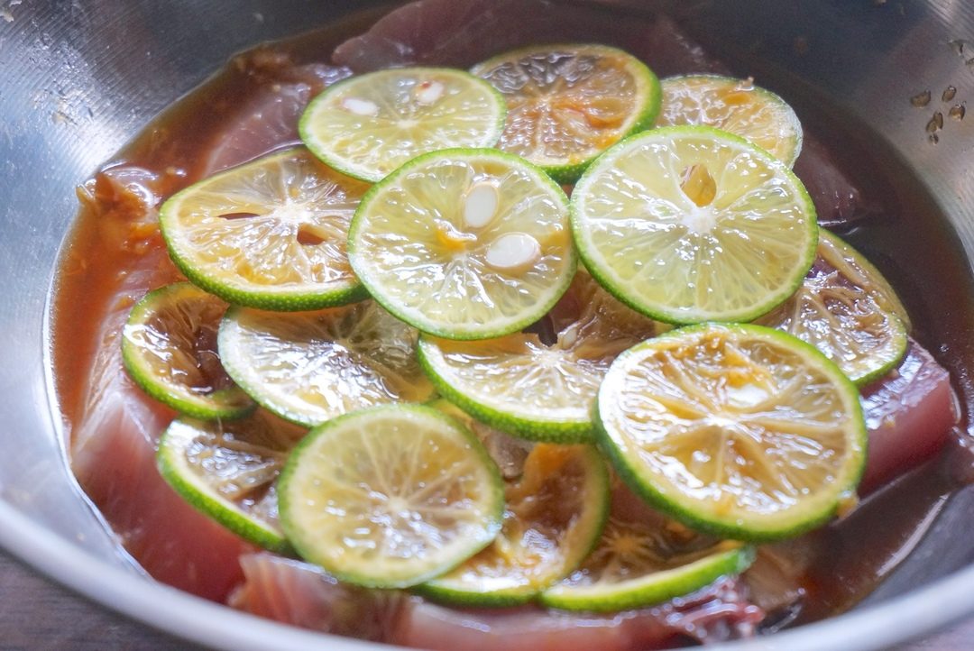 スダチは薄くスライスする。ボウルに醤油、みりん、ショウガ、スダチのスライスを入れて漬けだれをつくる。カツオは食べやすい大きさの削ぎ切りにし、漬けだれへ漬けて冷蔵庫で20分ほど置く。ミョウガはせん切りにし、冷水に5分ほどさらして水気をきる。