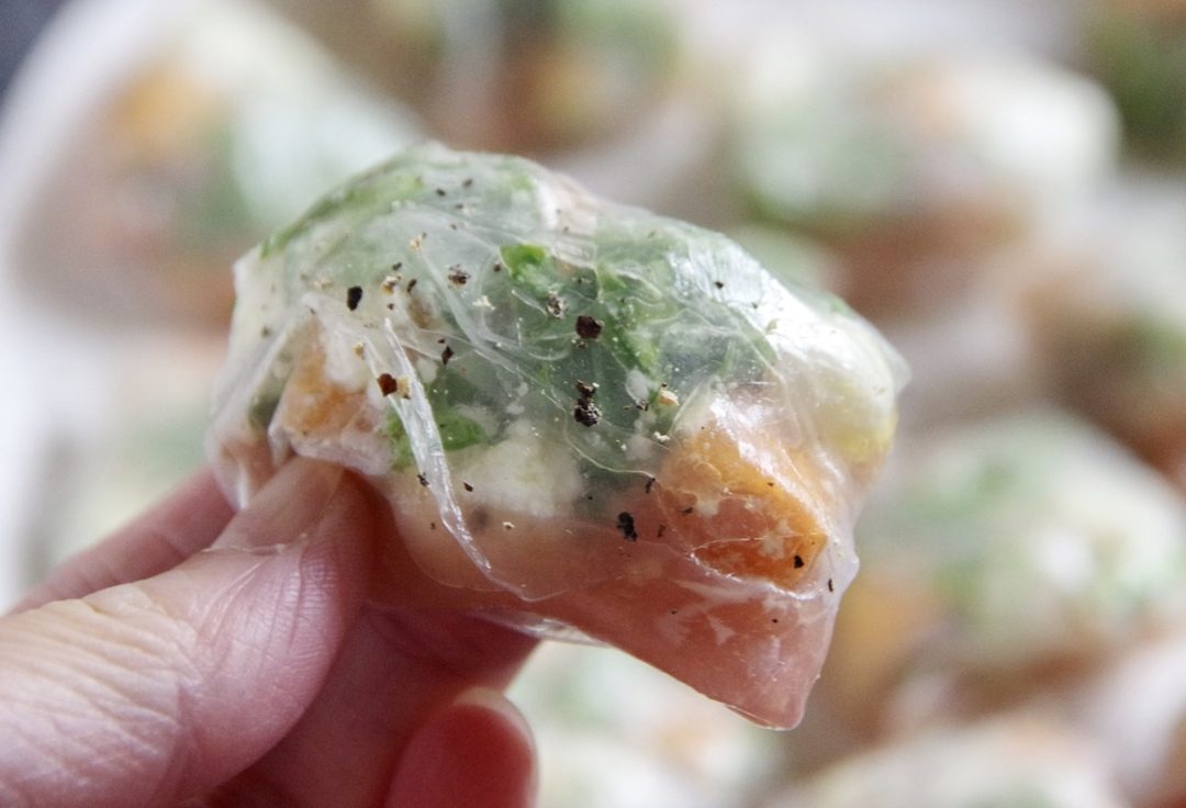 春菊と柿、生ハムとカッテージチーズのひとくち生春巻き