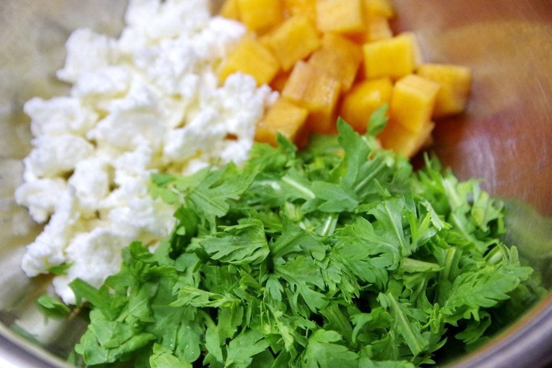 ライスペーパーは大きければ12cm四方程の大きさにハサミで切る。春菊はやわらかい葉を摘んでざく切り、柿は皮をむいて1cm角に切る。カッテージチーズはほぐしてボウルに入れる。
