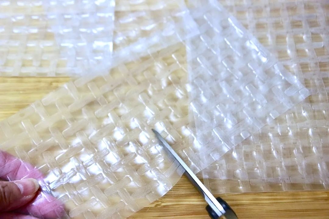 ※濡れたライスペーパーは重ねるとくっついてしまうので、水にくぐらせやわらかくなったらひとつずつ作業します。