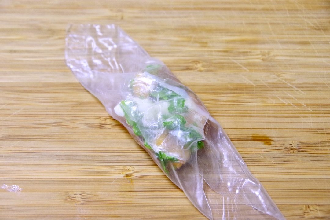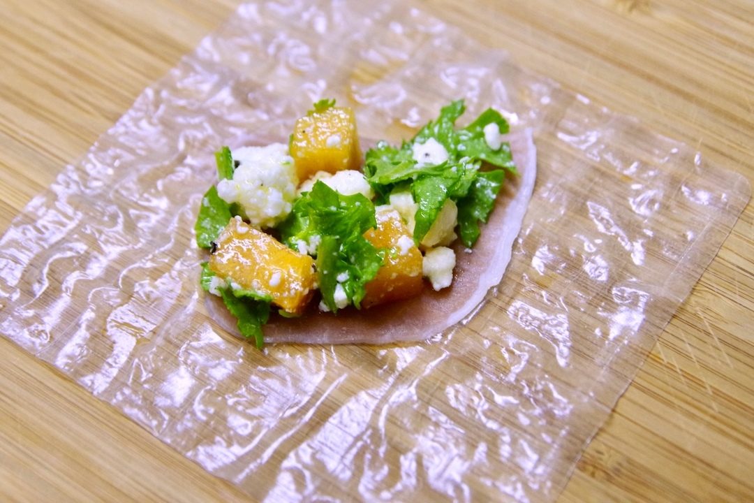ライスペーパーを水にくぐらせて生ハム1/2枚をおき、Step2を大さじ1程のせる。ライスペーパーを対角線上に包み、残った対角線の生地は食材の色が映りやすいように下に包む。なるべく重ならないように皿に並べ、粗挽き黒胡椒を挽く。