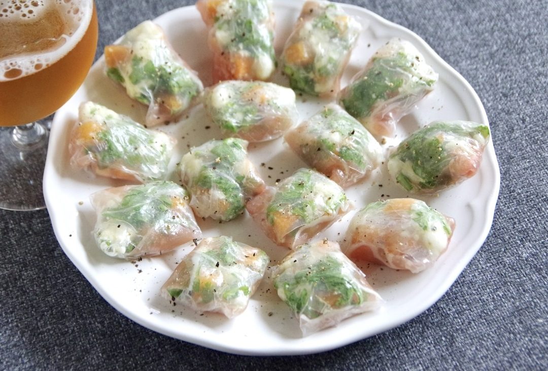 ひとくち頬張れば『生春巻き』がモッチモチで幸せビールタイムの始まり!『生ハム』の塩味に『柿』の甘味、さっぱりとしたコクの『カッテージチーズ』、適度に入れた『春菊』がほのかに香るハーブの役割をしていてバランスのいいおつまみです。レモンのドレッシングで和えるので意外にもIPAやウエストコーストがピッタリ。おいしすぎて沢山作っても足りないかも〜♪