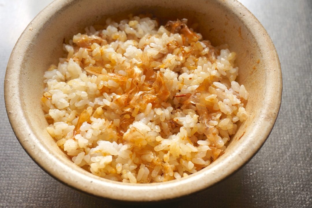 耐熱容器へごはんを入れ、バター、カツオ節、醤油を混ぜ合わせて平らに均す。