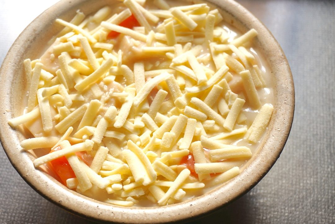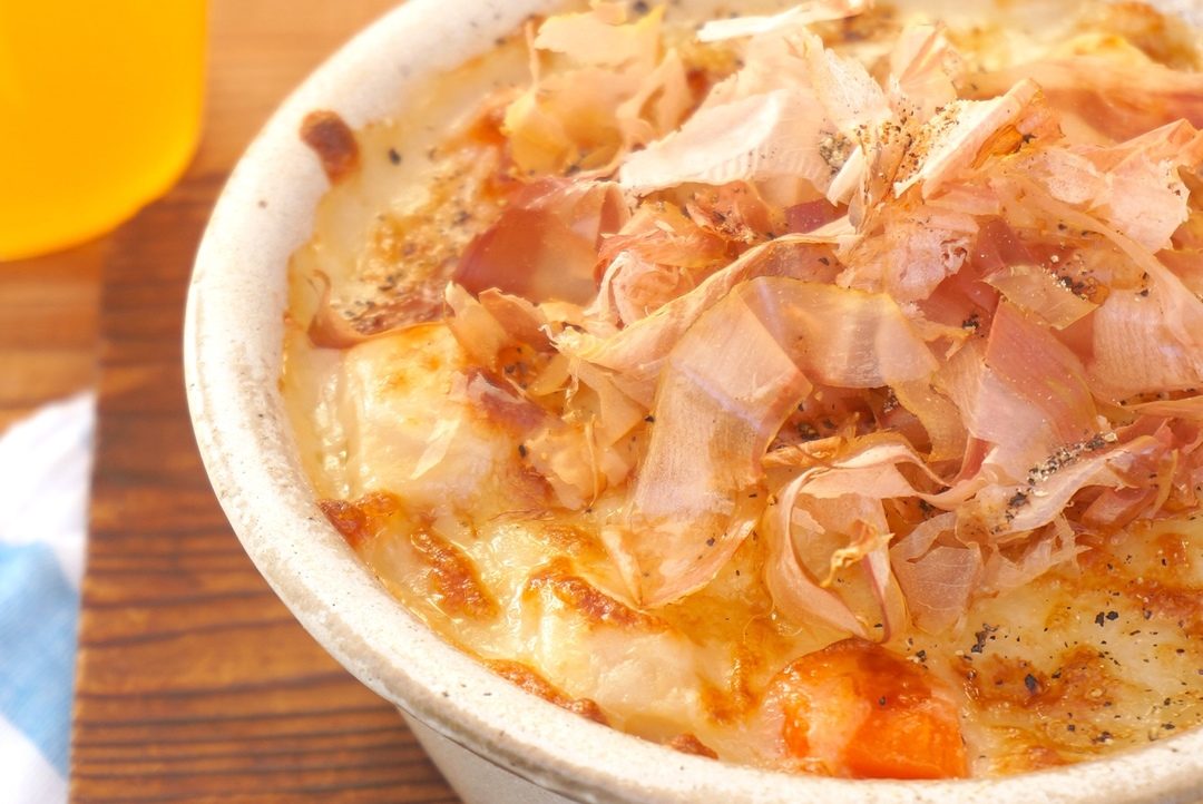 Step1の上からクリームシチューをかけ、ピザ用チーズをたっぷりのせてオーブントースターで約6〜7分焼く。チーズに焦げ目がついたら取り出し、仕上げにカツオ節をかけ、醤油をひと回しかける。コショウを多めに振って完成。