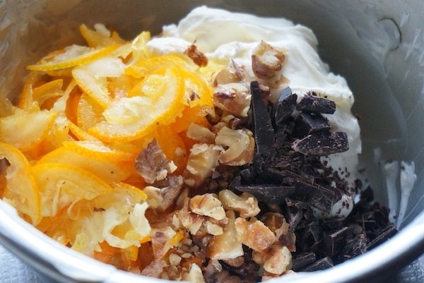 クルミをアルミホイルにのせ、トースターで約1分、香ばしく香りが立つまで焼いて荒く刻む。ビターチョコレートは包丁で細かく刻む。キンカンは半分に切り、種を取り除いて薄切りにする。それぞれ盛り付け用に、少しずつ取りおく。