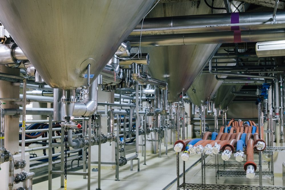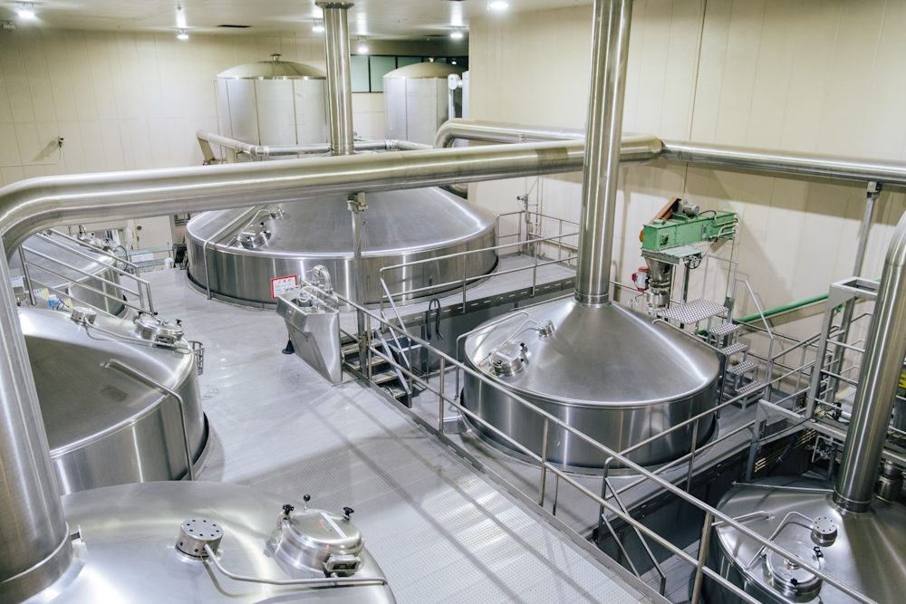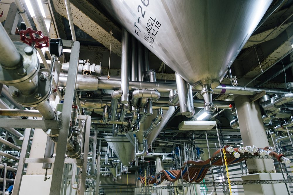 まず最初に向かったのは、ビールを醸造する発酵・熟成タンクのあるエリア。正面のノスタルジックな雰囲気とは打って変わって、機械や配管が張り巡らされた間を進んでいきます。