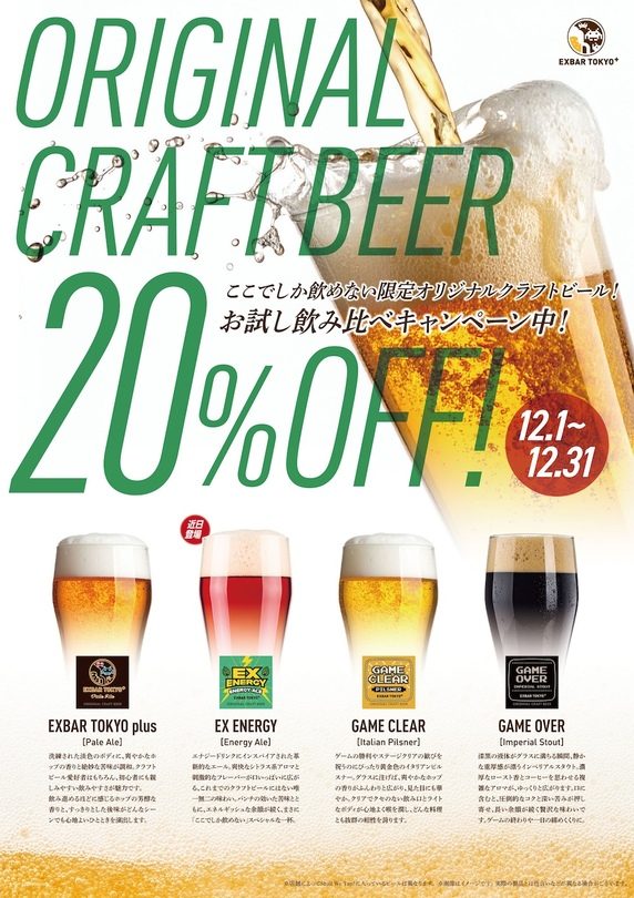 オリジナルクラフトビールの販売開始を記念して、「EXBAR TOKYO plus 秋葉原」でのみ、12月1日(月)〜12月31日(水)の期間限定で特別価格キャンペーンを実施します!