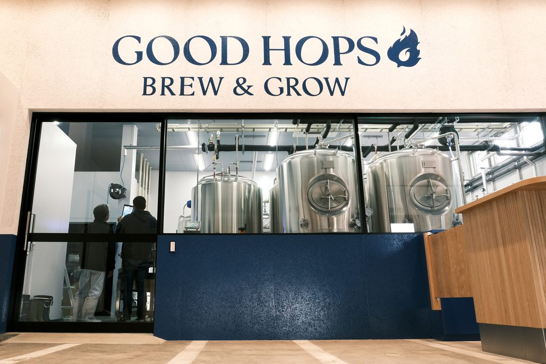 田村さん「自分たちの活動の根底には『地域や社会を良くしたい』という想いがあるんです。ホップを守ることも課題を解決することも、全部“良くするため”に行なっている。会社名の「BrewGood」にも入っていますが、“GOOD”は入れたいと思っていました。そのうえで、新しいブルワリーの名前を考えたときに、やっぱり僕たちが注目しているのはホップなので、「GOOD HOPS」に。さらにロゴの下に「BREW & GROW」をつけたのは、ホップを育てることとビールをつくること、その両方をやっていく拠点にしたいっていう意味を込めました」