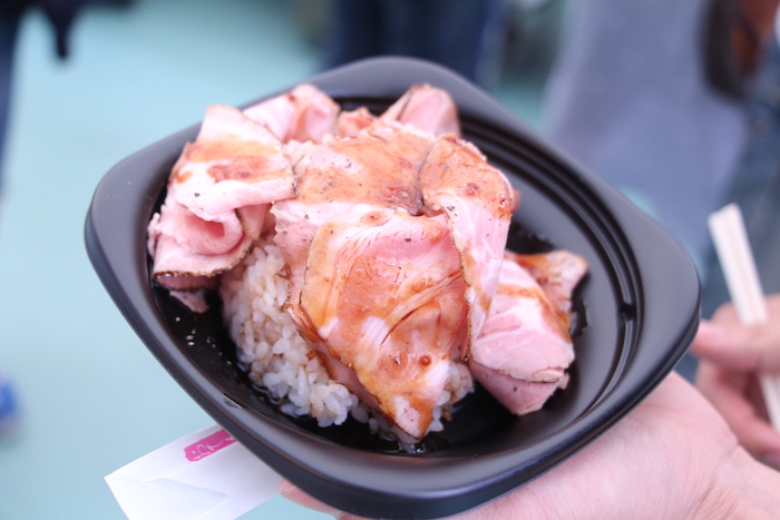 希少なブランド豚「沖縄島豚黒将」を使用した「ローストポーク丼」(500円)。特製ソースがたっぷりとかかって、その美味しさについつい笑顔がこぼれます。