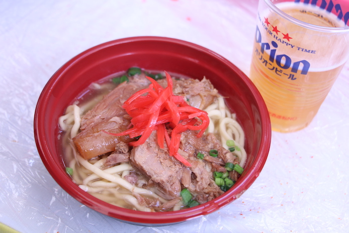軟骨がとろとろになるまで煮込んだ「軟骨ソーキそば」(700円)。口の中で溶けるように広がる肉の旨味が絶品。禁断のビール×炭水化物はやっぱり美味しい!