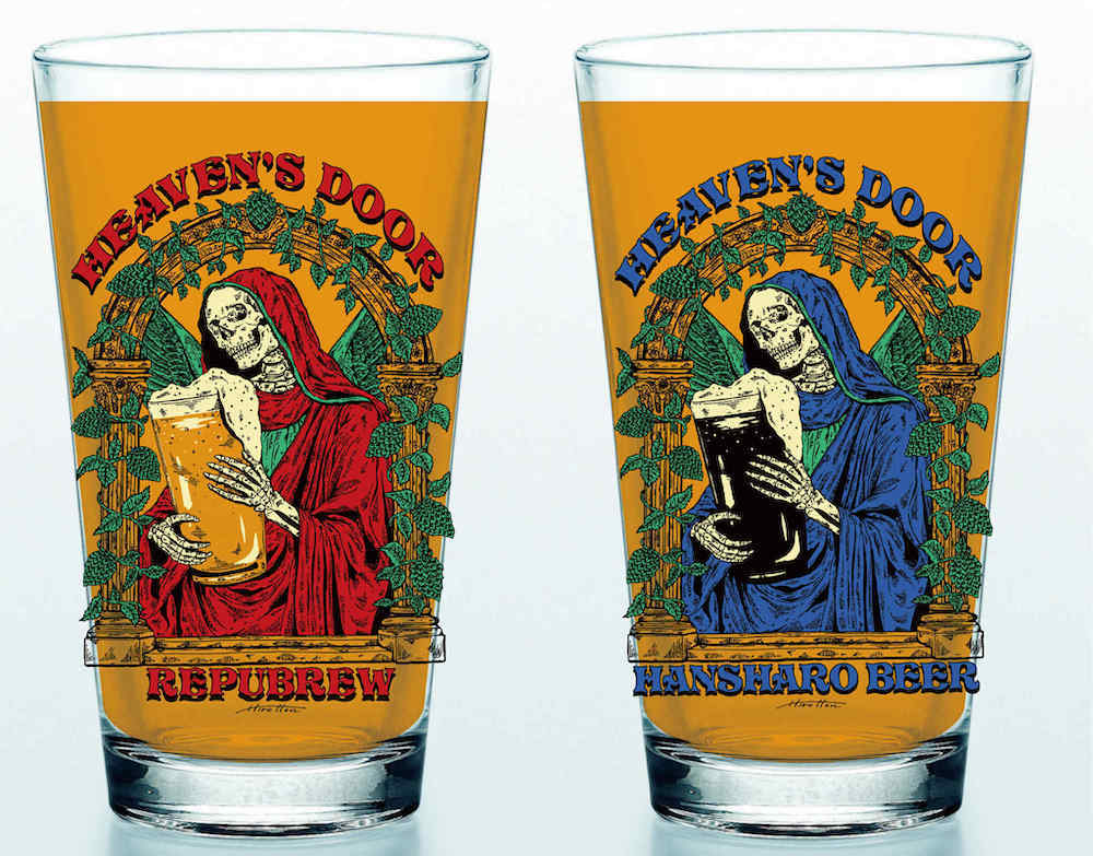 静岡県出身の世界的デザイナーHIROTTON氏が手掛ける”HEAVEN’S DOOR"のデザインをあしらったパイントグラス。コラボレーションしたREPUBREW Ver.と反射炉Ver.がセットになったお得な2色のパイントグラスセットです。
