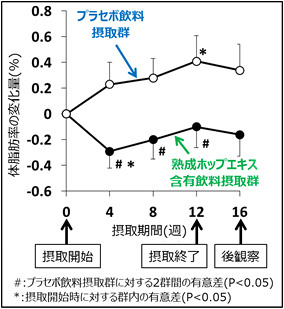 摂取開始前、摂取期間中、摂取終了後に、内臓脂肪面積と体脂肪率を測定。