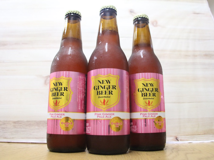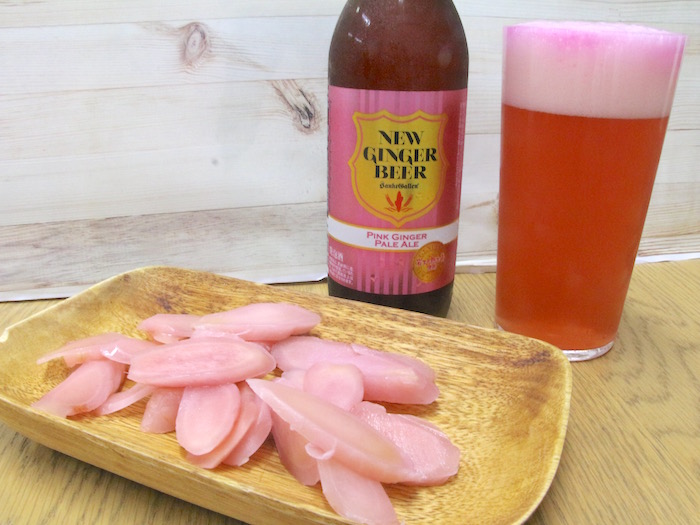 「生姜味のビール…!?」 と、ちょっと怪しまずにはいられないこのビール。普通のビールと比べて1.2倍の麦芽と2倍のホップを使用した味わい深いエールビールに、「岩下の新生姜」の粉末を加えて醸造されたものです。