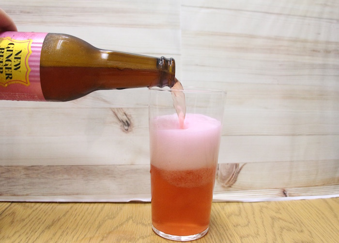 グラスに注ぐともこもこと立ち上がるピンク色の泡がなんとも印象的。生姜の香りがほのかに鼻をつつきます。
