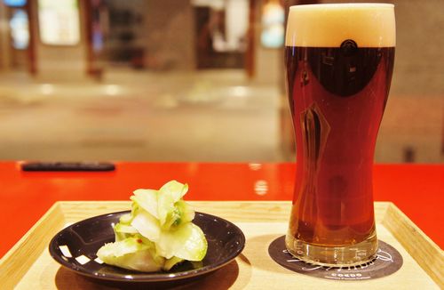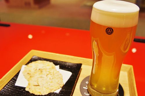 コエドビールの樽生が 3 種類(白・伽羅・紅赤)がすべて 700 円(税別)でいただけます。日本橋の老舗店のおすすめおつまみとのセットは、900 円(税別)とリーズナブル。バーと違ってテーブルチャージもないので、カフェ感覚でサクっと、粋なソロ飲み体験ができますよ! 日本橋をもっと若い人にも知ってもらいたいという想いで案内所を運営しています。日本橋には老舗と呼ばれるメーカーが多くあります。商品は案内所で販売しているものもありますし、コンシェルジュにぜひ聞いていただいて、実際に老舗店へ足を運んでいただきたいと思っています。女性一人でも気軽にお越し下さいね。 コエドビール「白」には、270 年の老舗「八木長本店 かつおぶしせんべい」を合わせて。 コエドビール「紅赤」には、「日本橋 古樹軒 緑色ザーサイ」。軽い塩味がクセになります。