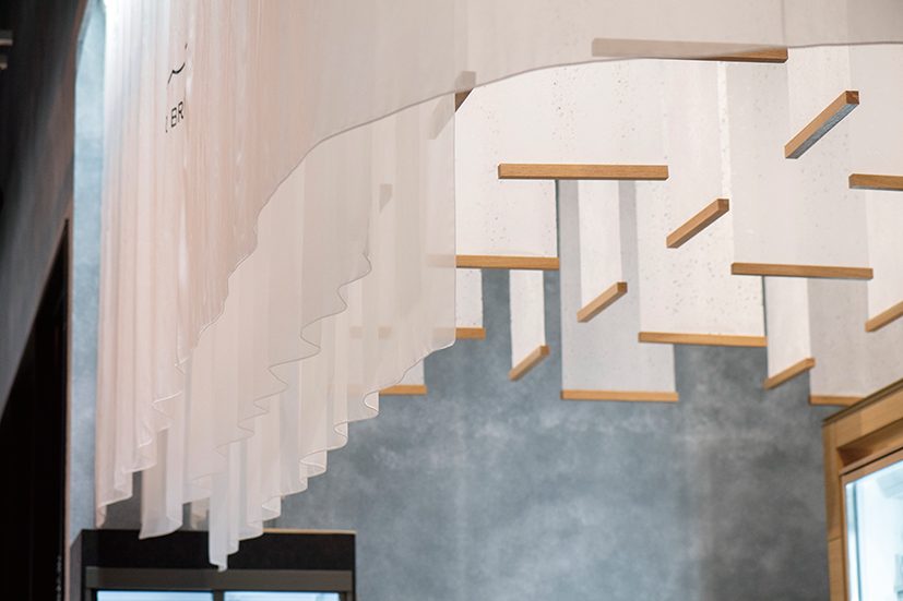 ふと見上げると飛び込んでくる天井から吊るされている紙は、福井の伝統工芸である越前和紙。光を受けるとビールの泡が立ちのぼるような表情にも見えます。越前和紙の歴史は1500年にも及ぶと言われている、日本三大和紙のひとつです。