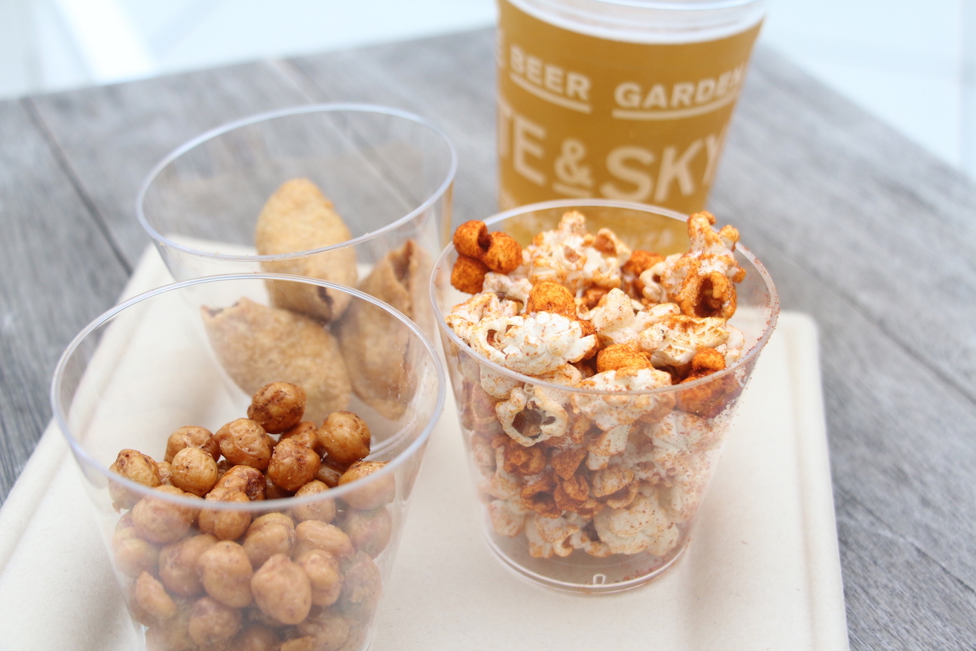ブラジリアンスパイスを効かせた”ピポカ”(ブラジリアンスパイスポップコーン)。取っては食べ、取っては食べ…止まらない魅惑のスパイスが詰まった味がします。その他にも、カプリチャナといわれるひよこ豆のスナック菓子や、三角の形をしたドライサモサなどのラテンスナックが揃います。どちらも香辛料が効いていてお酒が進む一品。