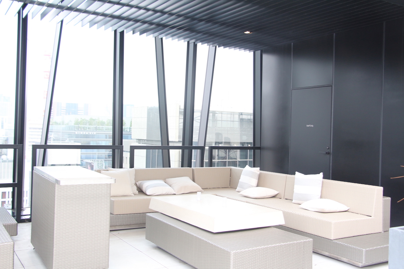 入り口を抜けると、スタイリッシュな癒しの空間の出現!銀座の街を一望できるのはもちろん、店内は真っ白なタイルに囲われ中央には水盤がお出迎え、まるでリゾート地に来ているかのような開放感を味わうことが出来ます。
