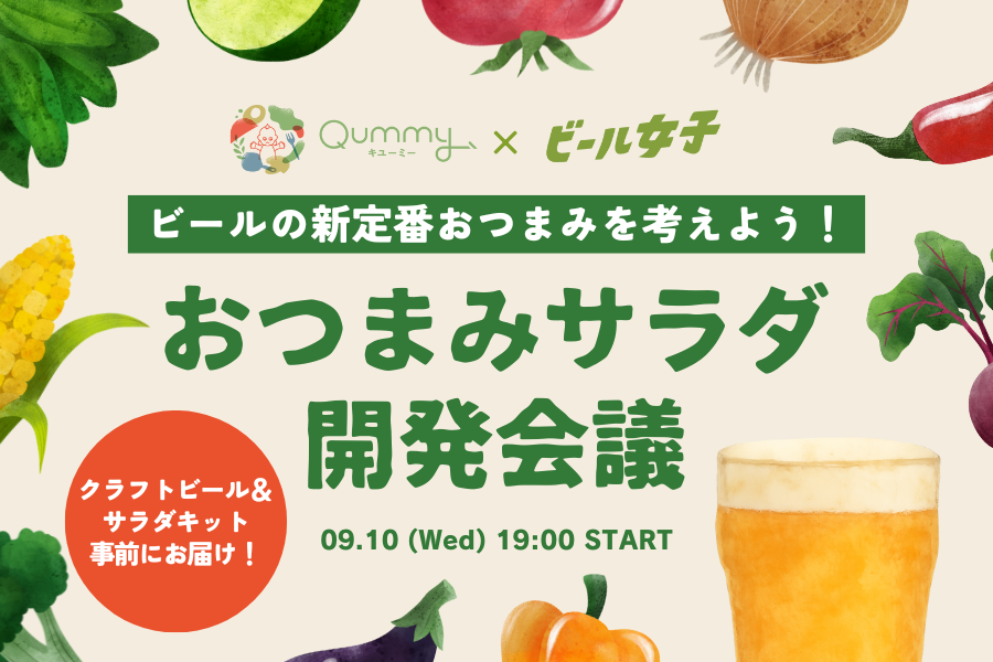 そんな声に応えるべく、WEBマガジン&コミュニティ「ビール女子」は、サラダやトッピング、ドレッシングなど野菜を楽しむ商品をご自宅にお届けするサービス「Qummy(キユーミー)」とコラボし、2025年9月10日(水)19:00 より、オンラインイベント『Qummy×ビール女子 おつまみサラダ開発会議』を開催します!