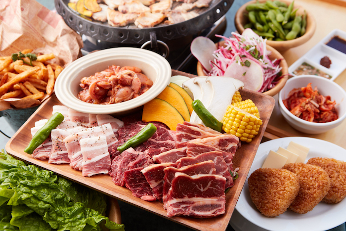 牛カルビ、豚バラ肉、スパイシーチキンなど様々な種類のお肉を味わえるBBQセット。焼き野菜やおつまみ3品の他に、バター焼きおにぎりやアイスキャンディーなどシメやデザートも揃っています。プラス500円で、お肉食べ放題にグレードアップ可能。