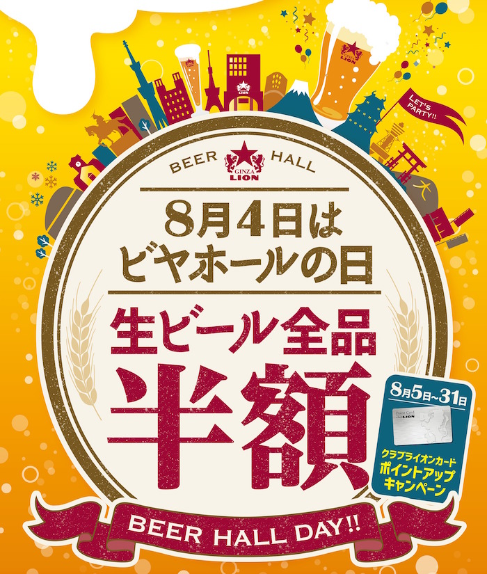 8月4日はビヤホールの日!全国のサッポロライオンチェーン(YEBISU BAR 黒塀横丁店他一部店舗を除く)173店舗にて、創業祭「8月4日はビヤホールの日。」として、生ビール全品が終日半額にて提供されます。