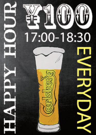 平日も休日も毎日、17時から18時半はハッピーアワー。カールスバーグが100円と激安で提供されます。