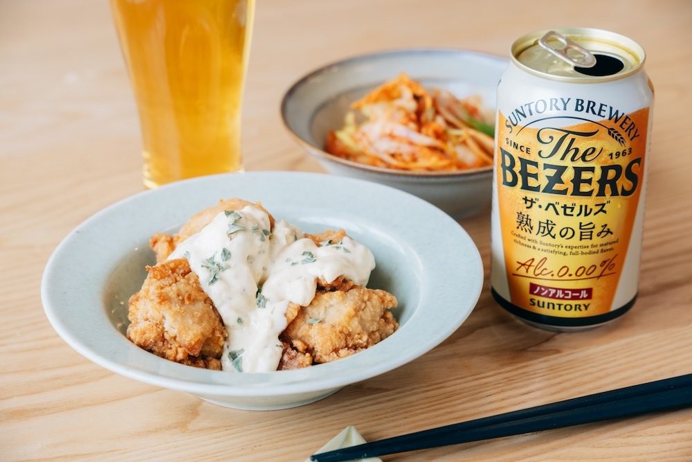 ここで「ザ・ベゼルズ」の登場!グラスに注ぎ、泡が静かに立ち上るのを眺めてから、まずは唐揚げのタルタルがけを一口。タルタルで唐揚げがさっぱりといただけて、箸が進む!そして、「ザ・ベゼルズ」も進む!