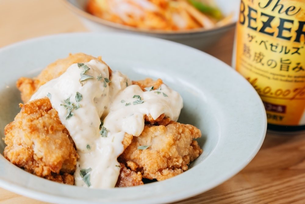 唐揚げタルタルは、唐揚げに市販のタルタルソースをかけるだけ。衣のざくっとした手触りをタルタルソースがやわらかく包んで、皿の上が一気ににぎやかになる。
