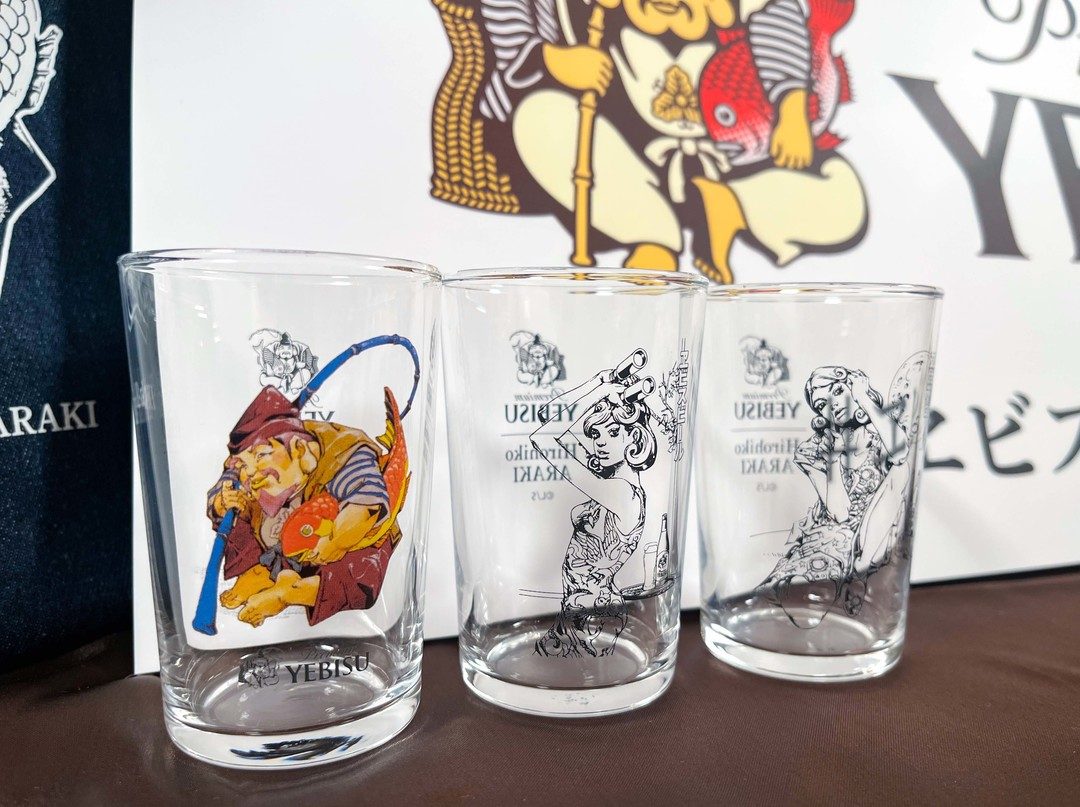 6オンスグラスは、3種セットでの販売。恵比寿様が1種、第2弾コラボデザインが2種のセットです。